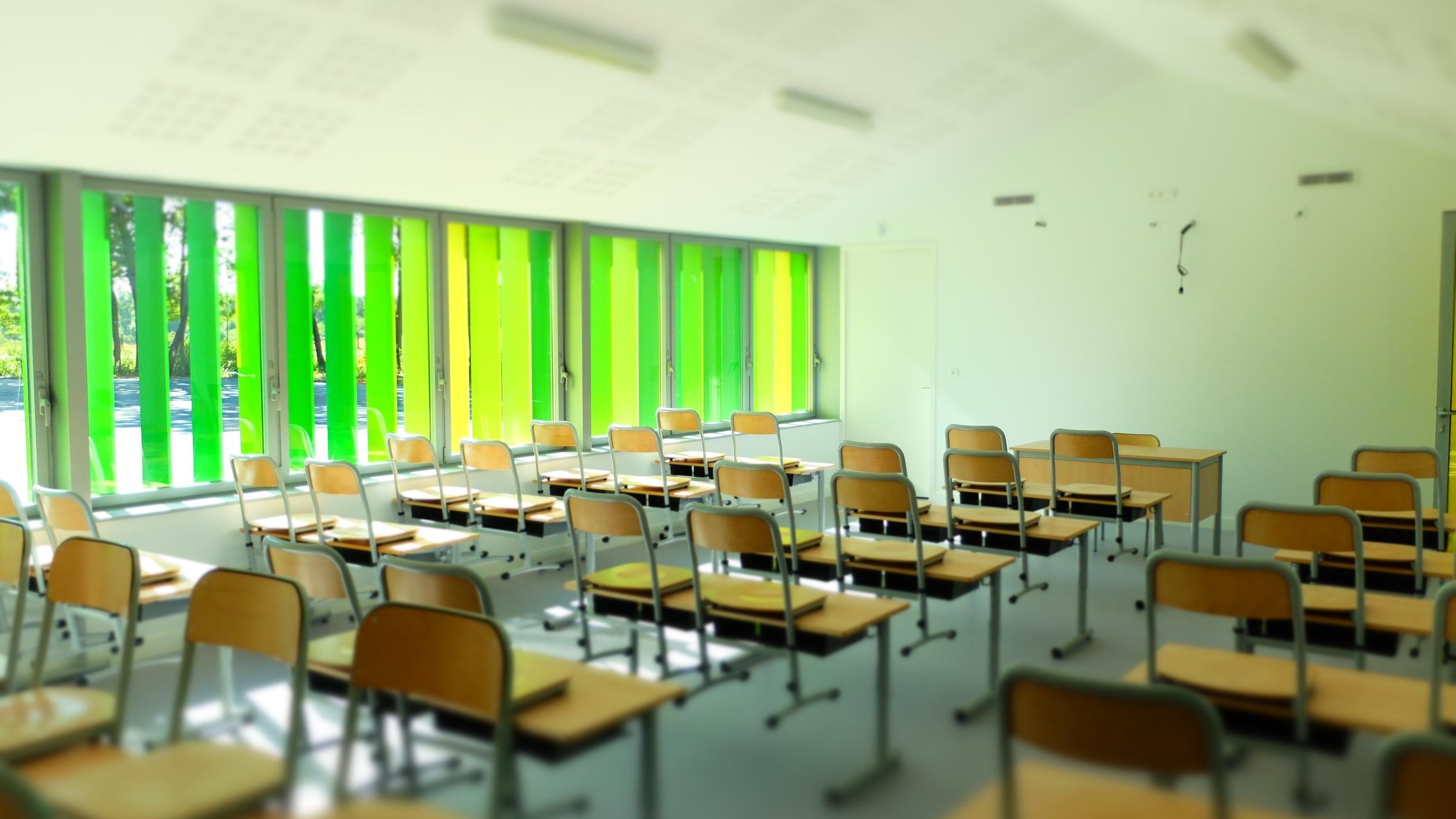 The six classrooms, the cafeteria, the teachers' meeting room and function rooms are fitted with sensors that measure the room temperature and CO2 content; the measured values are used to control the VFC volume flow controllers for supply air and extract air. Up to 4200 m3 air can be treated per hour. The energy-efficient system ensures that the rooms are not unnecessarily ventilated outside of school hours. Even more energy is saved with integral adiabatic cooling. Heat pumps or other cooling systems are hence not required.