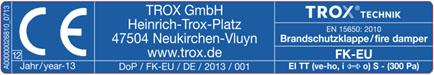 TROX Brandschutzklappen tragen seit dem 1. September 2012 ein CE-Kennzeichen gemäß Produktnorm EN 15650. Damit ist der freie Warenverkehr von TROX-Brandschutzklappen mit sämtlichen geprüften Anwendungen in der EU sichergestellt.