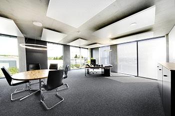 Die Büros und Konferenzräume sind lichtdurchflutet. Für die Durchflutung der Räume mit ausreichend aufbereiteter Außenluft sorgen dezentrale Zu, Ab- und Sekundärluftgeräte der Serie FSL-U-ZAS, die im Hohlraum der Etagenböden entlang der Fassade untergebracht sind. Der Außenluft kann zusätzlich Sekundärluft beigemischt werden, gesteuert durch eine Sekundärluftklappe, um den Zuluftvolumenstrom und damit die thermische Leistung zu erhöhen. Die Lüftungstechnik verschwindet also fast gänzlich, einzig die Lüftungsgitter unter den Fenstern sind noch sichtbar.