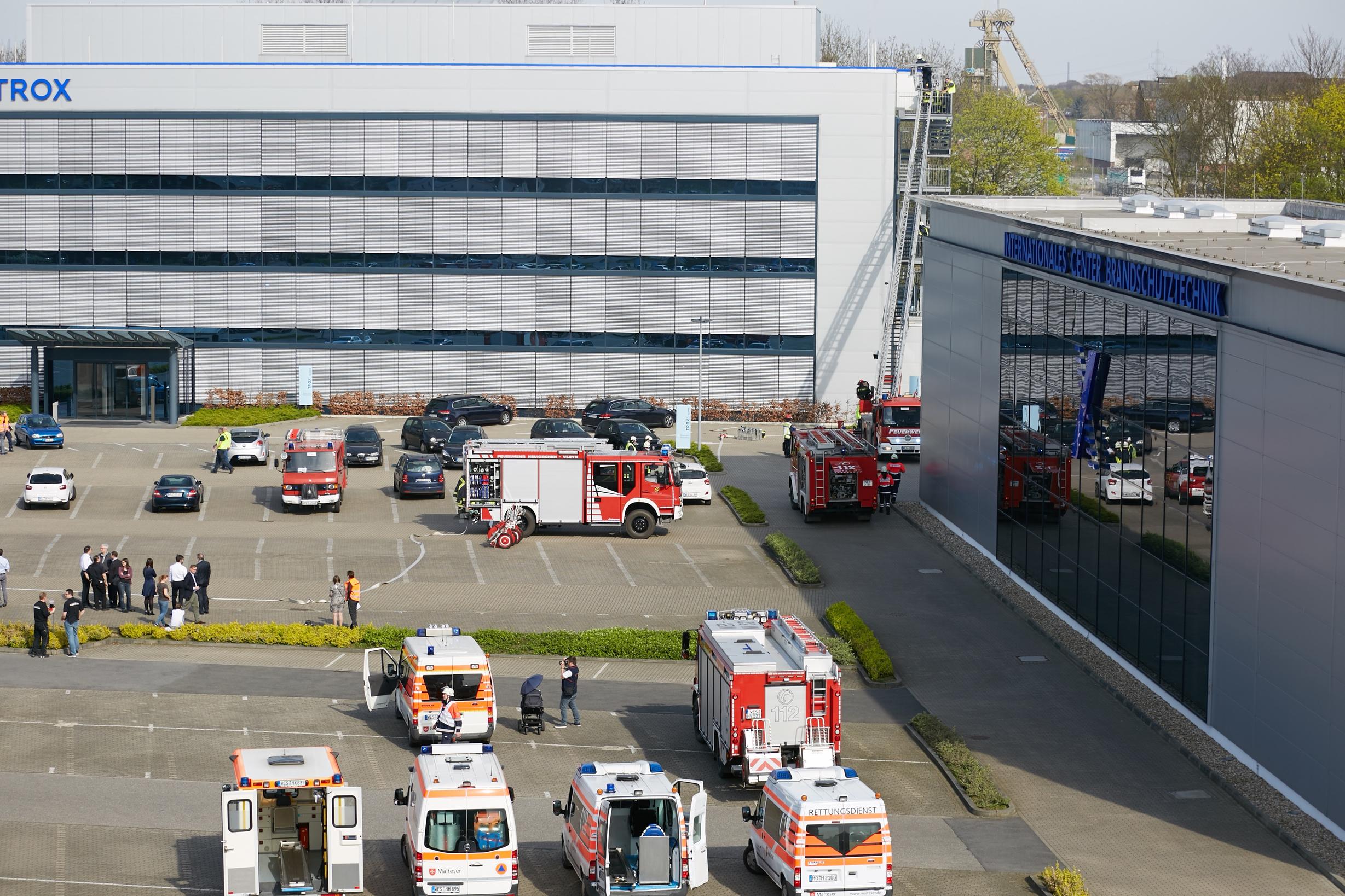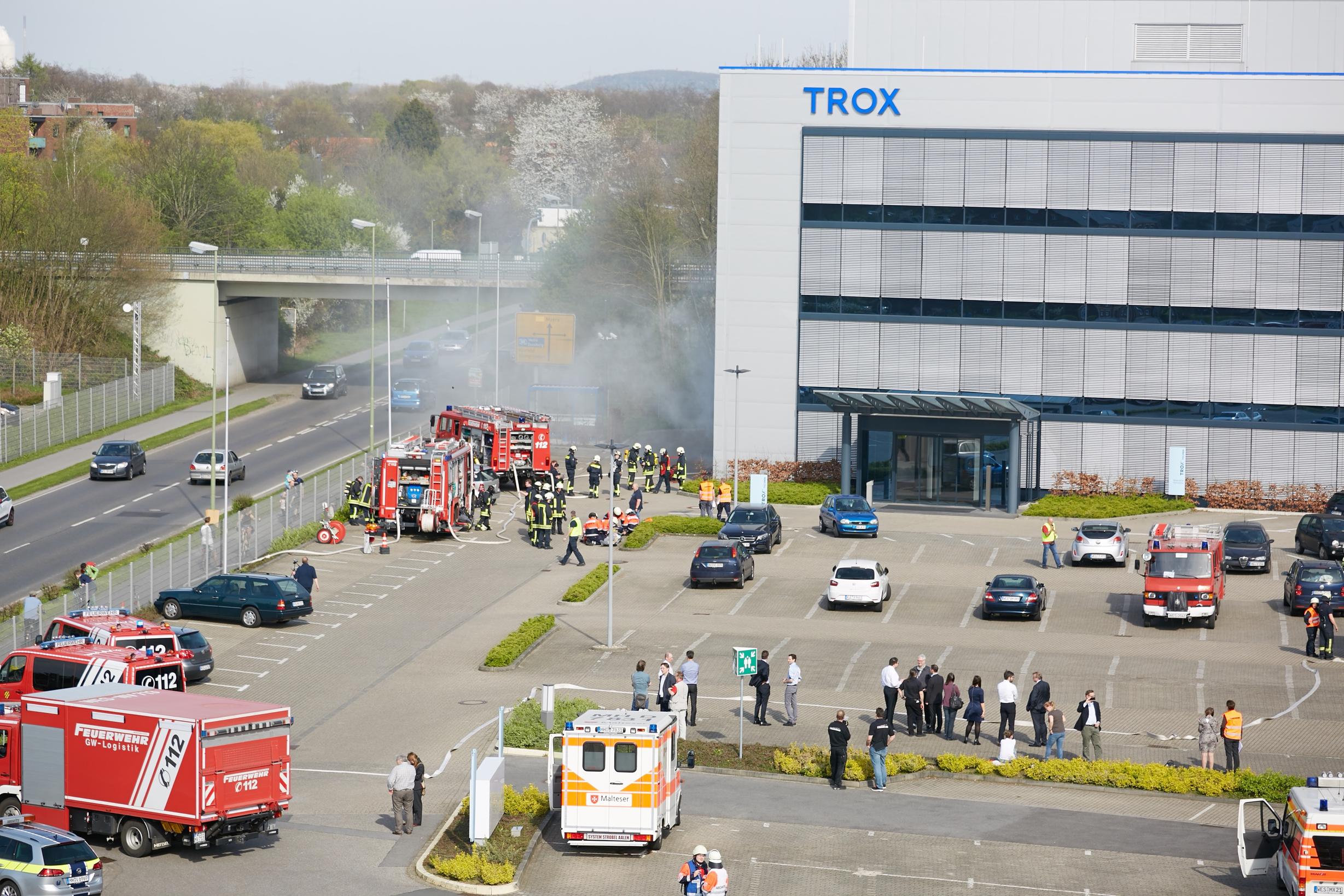 „Das, was wir heute mit der Freiwilligen Feuerwehr und auch mit dem Malteser Hilfsdienst geübt haben, wird hoffentlich so nie eintreten. Ein wesentlicher Teil unseres Geschäftes ist Gewährleistung der Sicherheit von Klima- und Lüftungsanlagen in Gebäuden durch vorbeugenden Brandschutz und auch durch Entrauchungssysteme, so Udo Jung, Geschäftsführer der Trox SE. „Wir arbeiten z.B. in der Normungs- und Verbandstätigkeit sehr eng mit den Berufsfeuerwehren in Deutschland zusammen. Daher ist uns die Gefahr aus-gehend von Bränden und daraus folgend der Rauchentwicklung sehr bewusst. In enger Zusammenarbeit mit der örtlichen Freiwilligen Feuerwehr finden regelmäßige gemeinsame Brandschutzbegehungen statt, um vorbeugend sowohl den baulichen als auch den organisatorischen Brandschutz zu verbessern. Regelmäßig werden TROX Mitarbeiter in allen Bereichen zu Brandschutzhelfern ausgebildet, die im Übungs- und schlimmer noch Ernstfall alle Mitarbeiter anweisen, das Gebäude unverzüglich zu verlassen.“